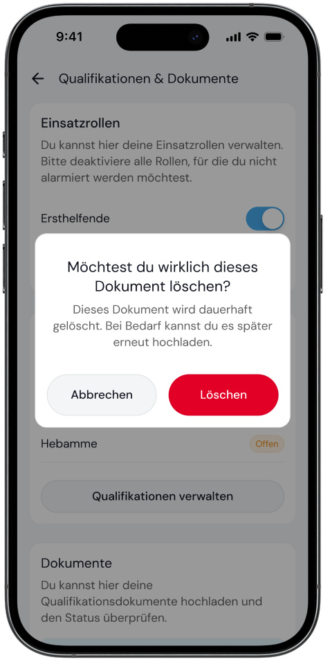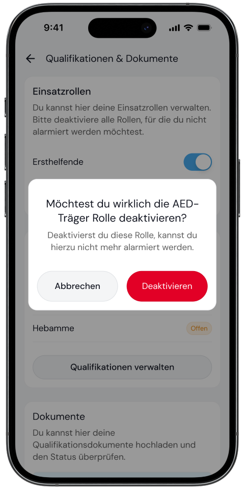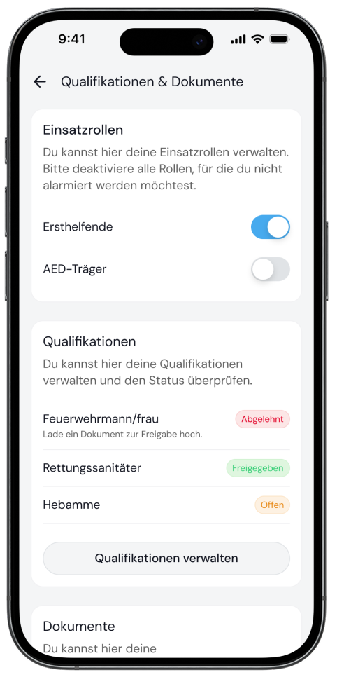 Deine hochgeladenen Dokumente werden von den regionalen Koordinierenden geprüft. Erst nach der Freigabe durch die Koordinierenden kannst du für die entsprechenden Rollen (z. B. „Ersthelfender“ oder „AED-Träger“) alarmiert werden.