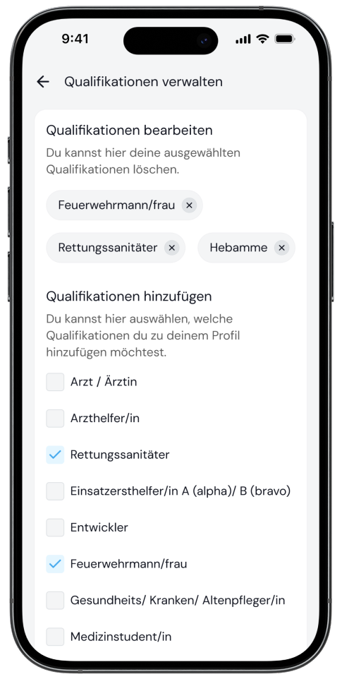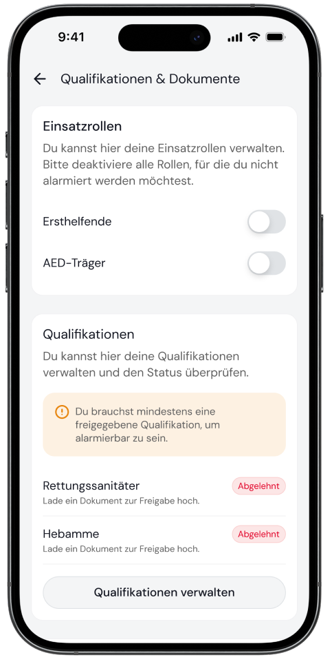 Du kannst Rollen, für die du nicht alarmiert werden möchtest, einfach abwählen. Diese Verwaltung erfolgt über die Funktion „Qualifikation verwalten“ im Profil der Mobile Retter App. Du musst jedoch beachten, dass mindestens eine Rolle ausgewählt bleiben muss, damit du überhaupt alarmierbar bist.