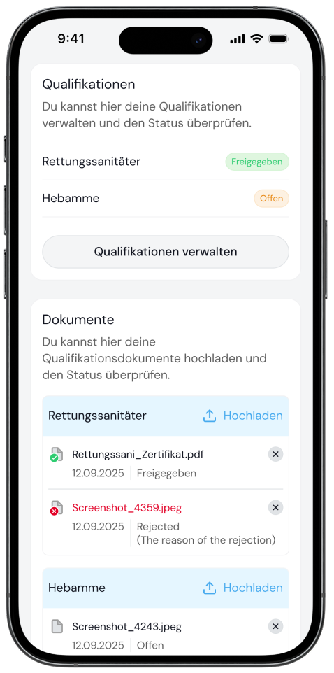 Der Status deiner Qualifikation wird in der App im Bereich „Qualifikation und Dokumente“ über eine Statusanzeige ausgegeben.