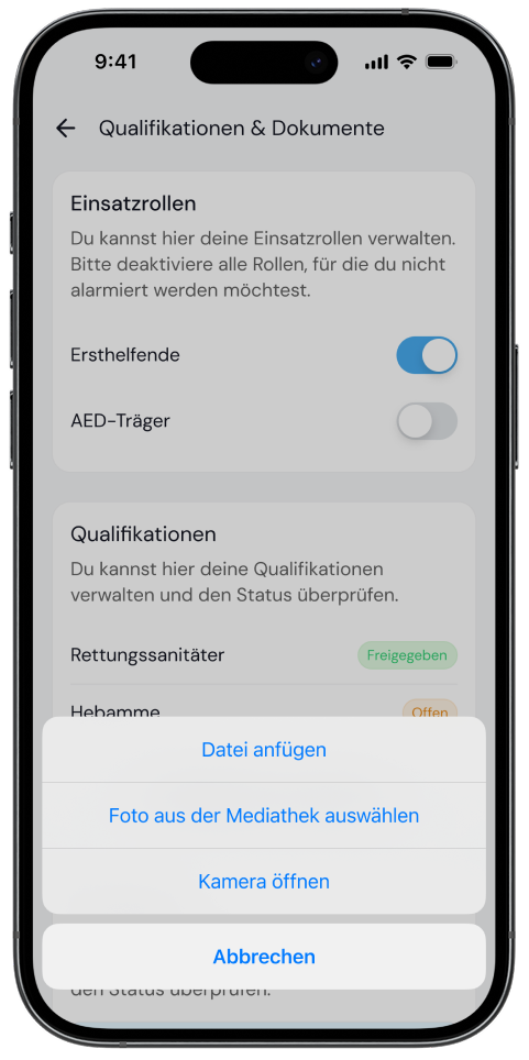 Der Status deiner Qualifikation wird in der App angezeigt; solange die Prüfung noch aussteht, hat sie den Status „Offen“. Nur wenn die Qualifikation den Status „Freigegeben“ hat, kannst du für die entsprechende Rolle alarmiert werden.